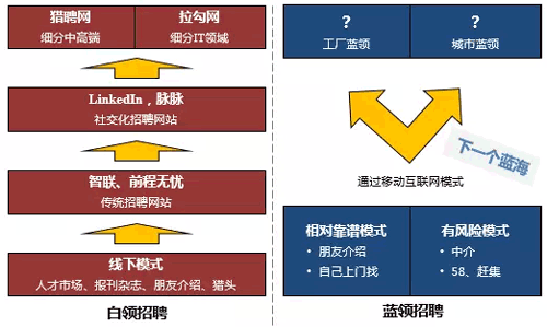 通過分析整個招聘行業(yè),我們看到白領(lǐng)招聘已經(jīng)互聯(lián)網(wǎng)化并進(jìn)入細(xì)分競爭階段。由于智能手機(jī)的普及,藍(lán)領(lǐng)招聘剛剛進(jìn)入移動互聯(lián)網(wǎng)化的窗口期,尚未有成型的玩家出現(xiàn)。信息源:揭陽人才網(wǎng)_www.m.xhcaiwa.com