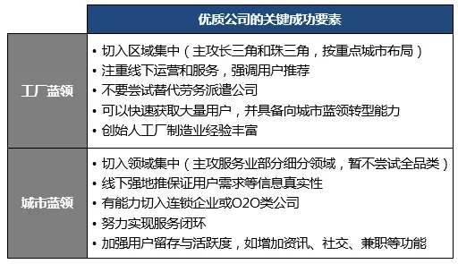 工廠藍(lán)領(lǐng)目前主要依靠線下勞務(wù)派遣公司,互聯(lián)網(wǎng)模式需要配合較強(qiáng)的線下運(yùn)營能力才可能切入,可以考慮的方向為:
